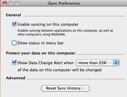 Nützlich zu wissen, ist natürlich das dieses Icon von iSync stammt. Mit gedrückter Alt-Taste und einem weiteren Rechts-Klick auf das Icon erscheinen nun weitere Optionen. Klicke nun auf „Open iSync“ und öffne dort unter iSync > Preferences die Einstellungen. Deaktiviere nun die Checkbox „Show status in menu bar“ und weg ist es…